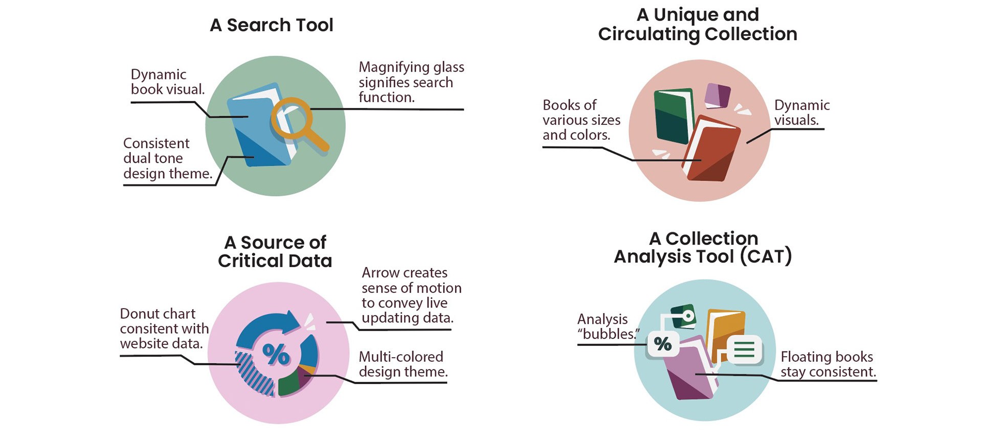 We created four icons to demonstrate the four main functionalities of Diverse BookFinder. They are more illustrative than traditional icons to be more appealing to young audiences and being more engaging when scaled up on the website homepage.