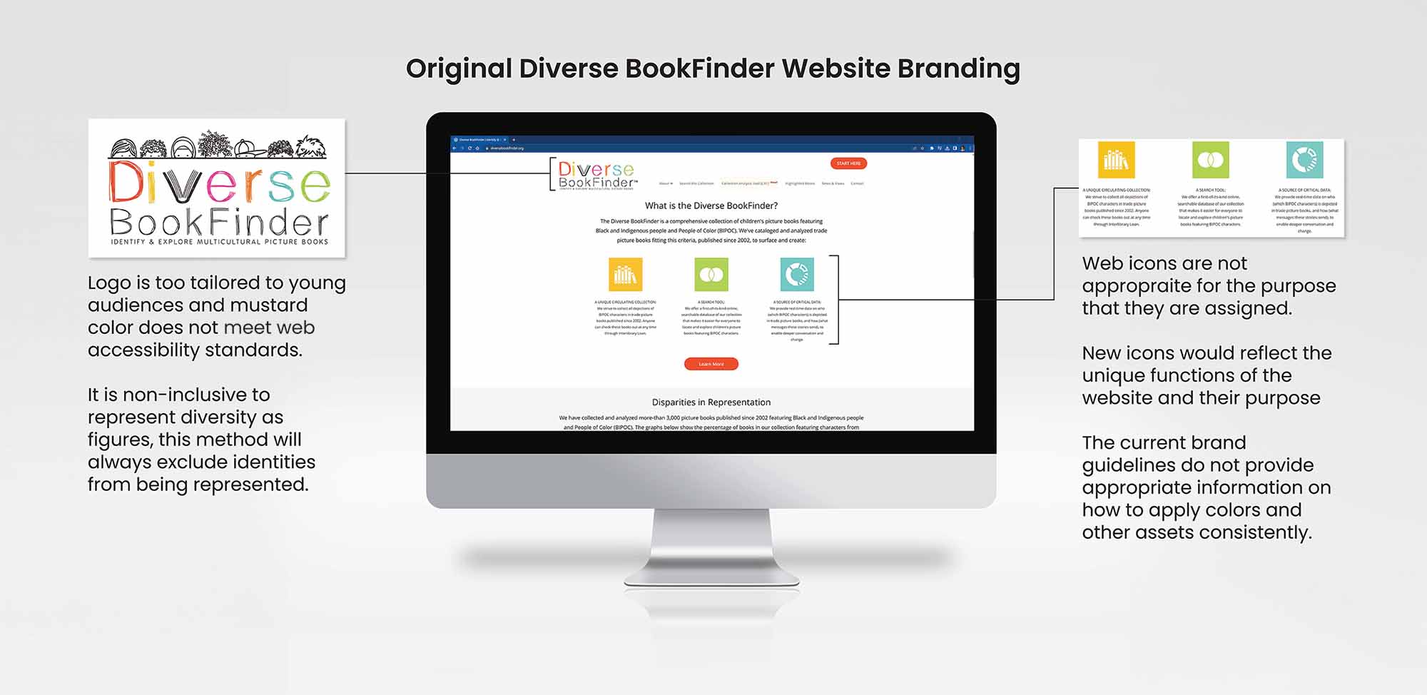 The stakeholders at Diverse BookFinder enjoyed the colorful branding that they had, but thought that it was too childish and didn't appeal to their new audience. There were many accessibility issues in their branding that had to be addressed, such as their colors and text sizing not meeting web accessibility standards.