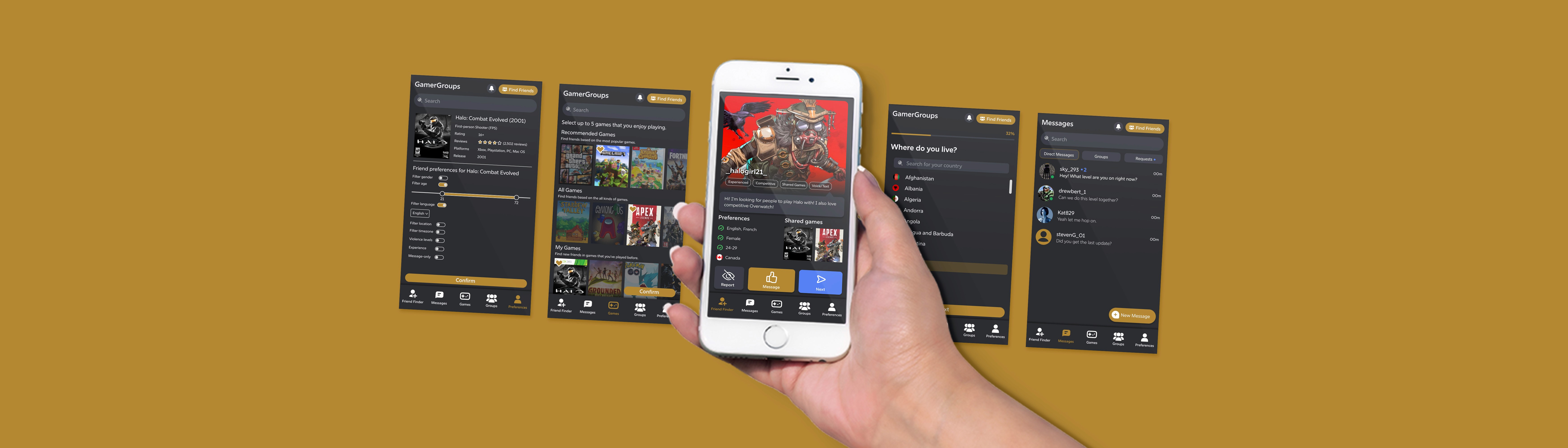 GamerGroups is an hypothetical app that allows people that are interested in online gaming to create friends and build communities. Users would be able to comfortably interact with others in a controlled environment.
