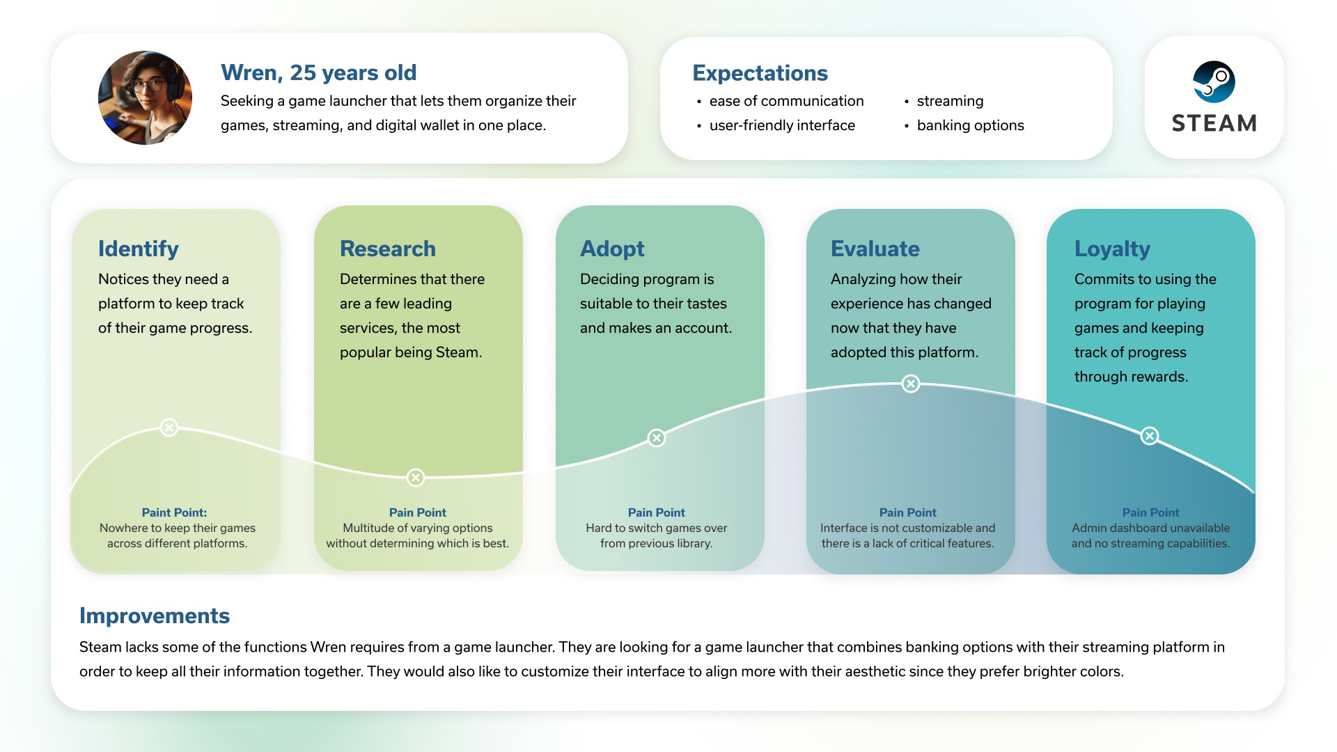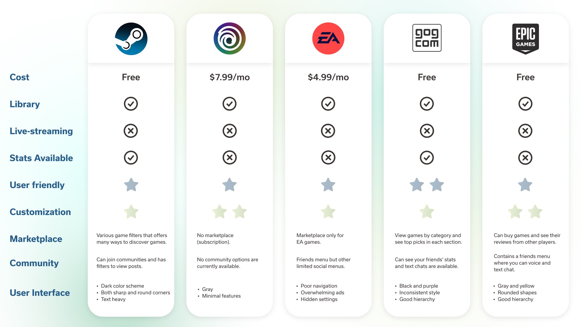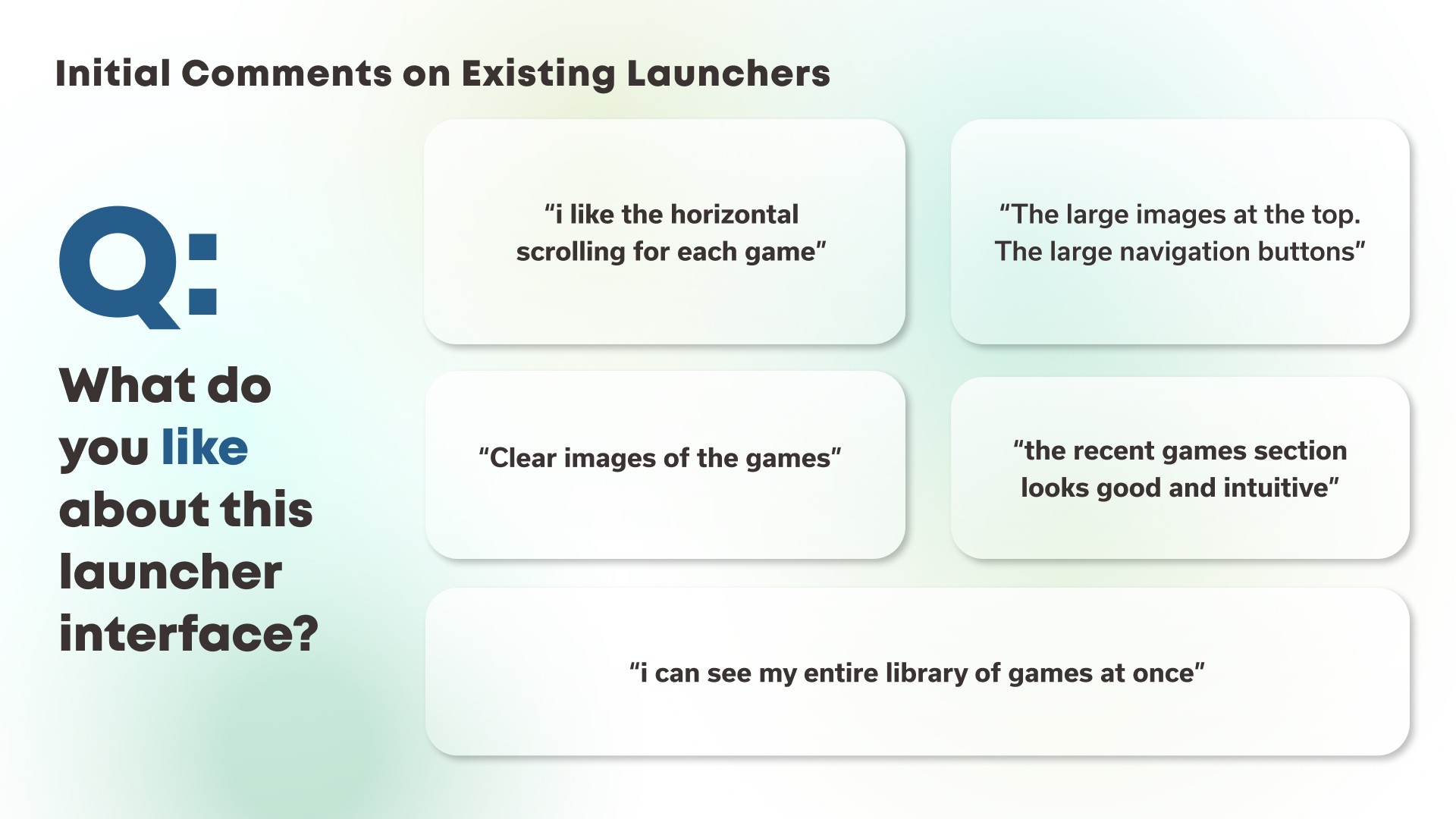 We began our design process with an extensive user research phase where we discussed gaming gender aesthetics, game launcher preferences, and interface pain points with a variety of respondents, both gamers and non-gamers. From this research, we learned that the top five streaming apps suffer from similar pain points: poor visual hierarchy, not meeting user needs, and limited functionality.