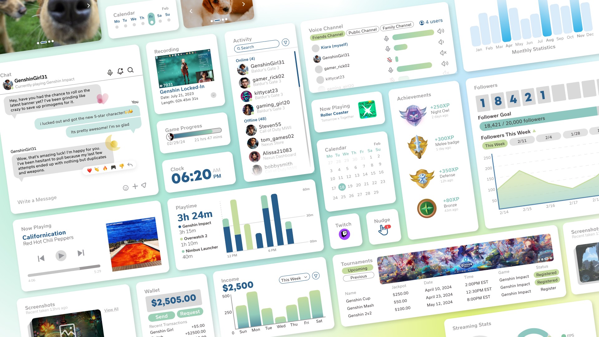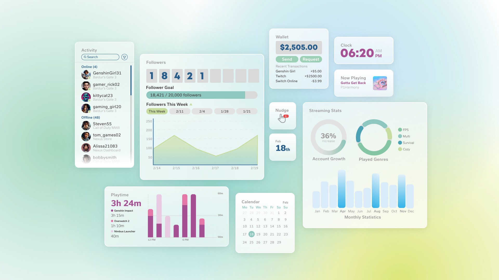 Users can drag-and-drop any of our widgets onto their administrative dashboard to focus their experience on connecting with friends, managing streaming income, tracking game progress, and much more.