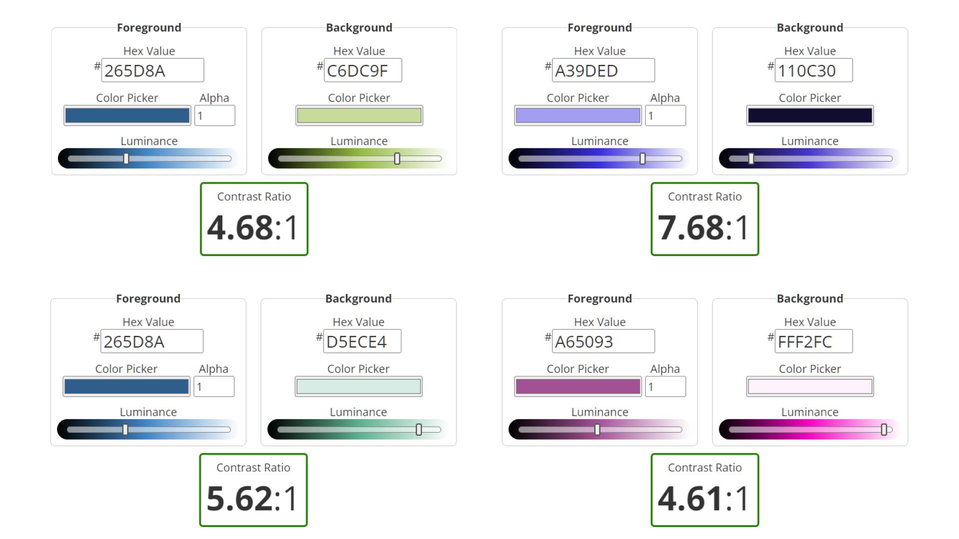 We checked for WCAG 2.0 web color accessibility requirements throughout our design process to ensure that users would be able to see our primary colors, even with limited visibility or color limitations.