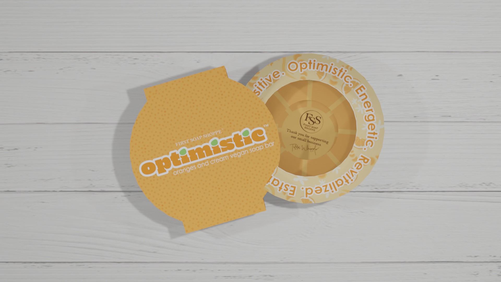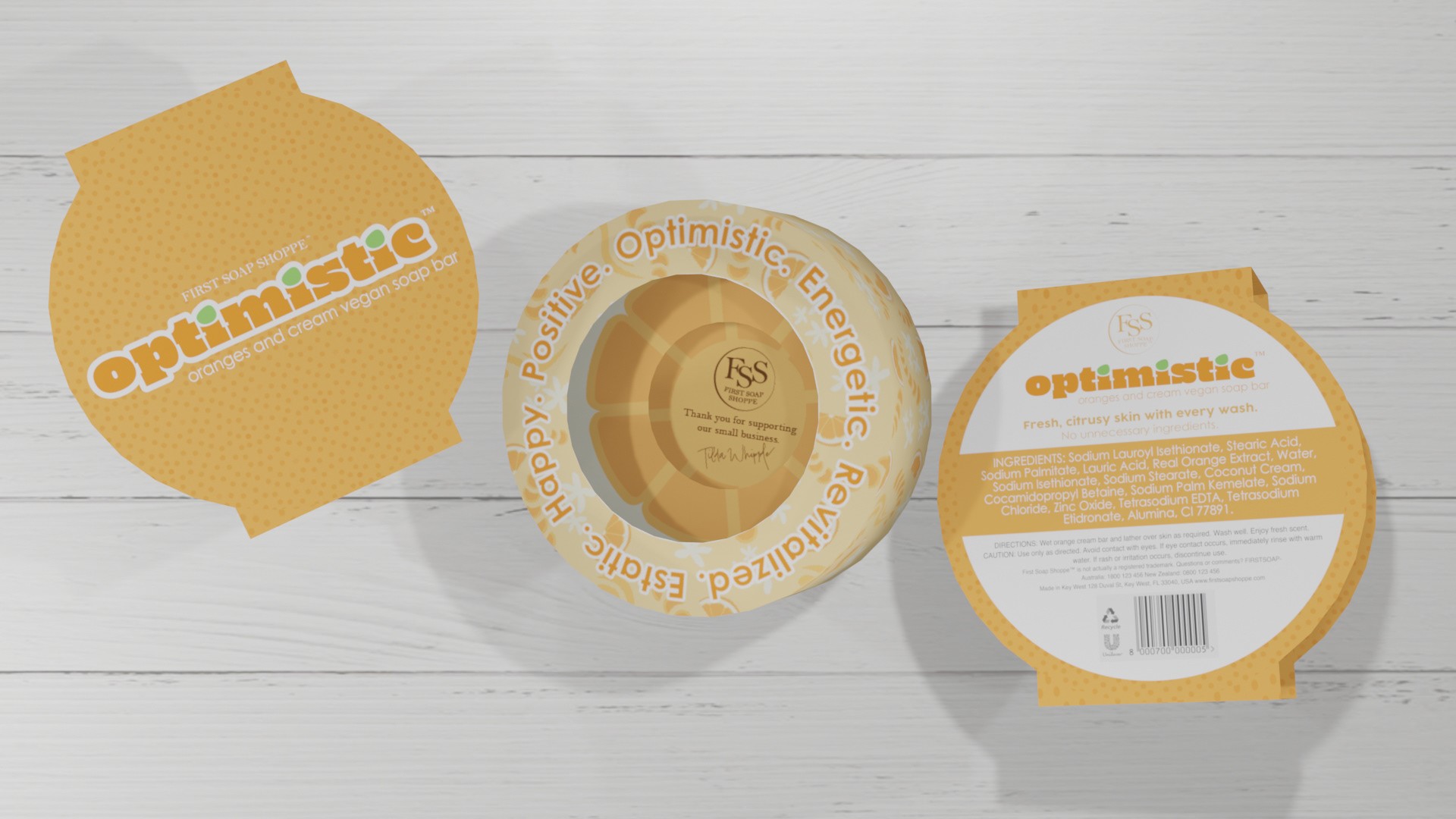 Optimistic is a hand soap line that captures the emotional aura of happiness and excitement through the tangible feeling of peeling an orange. The packaging pushes the complexities of a soap box, while respecting constraints of printing and production limitations.